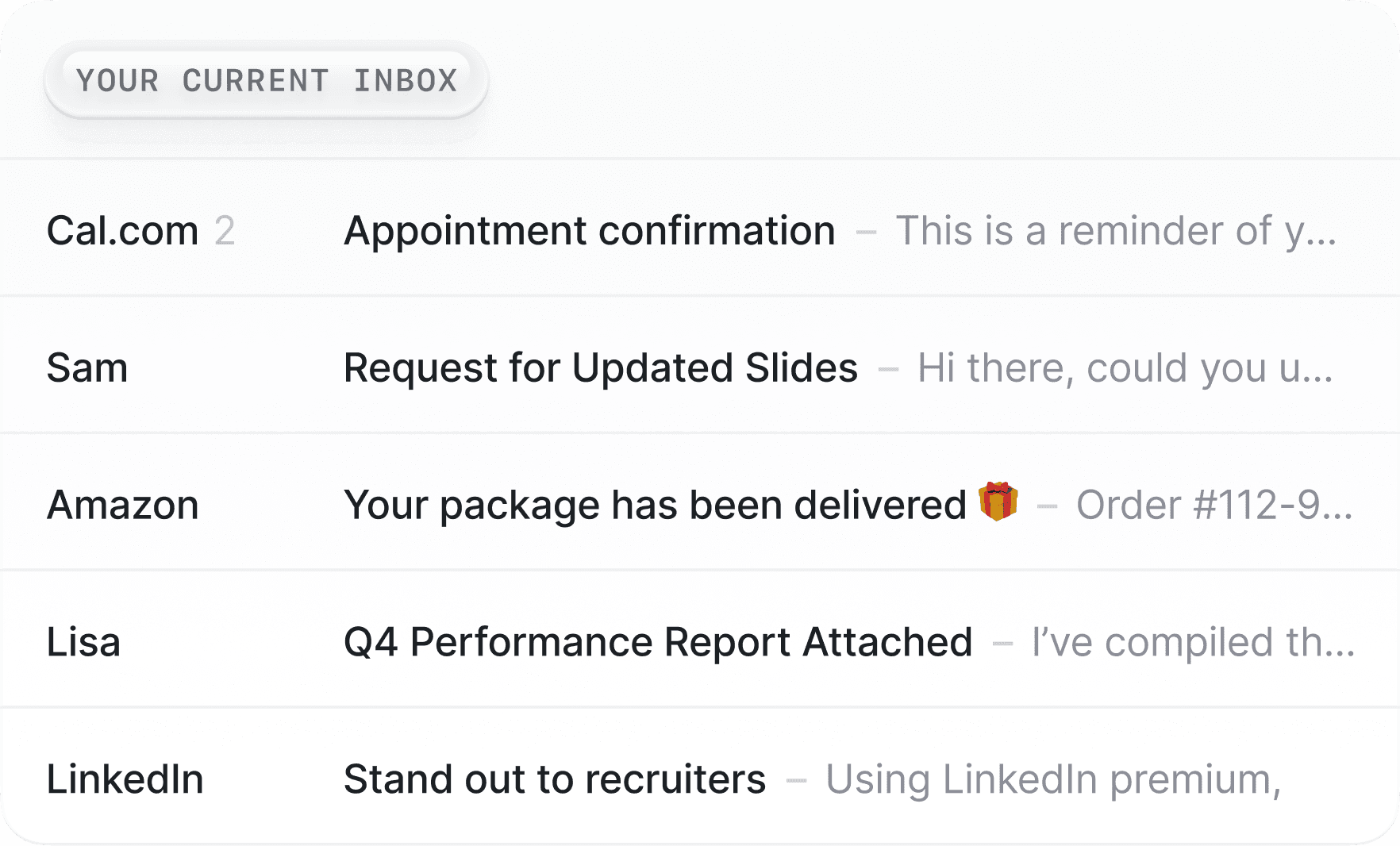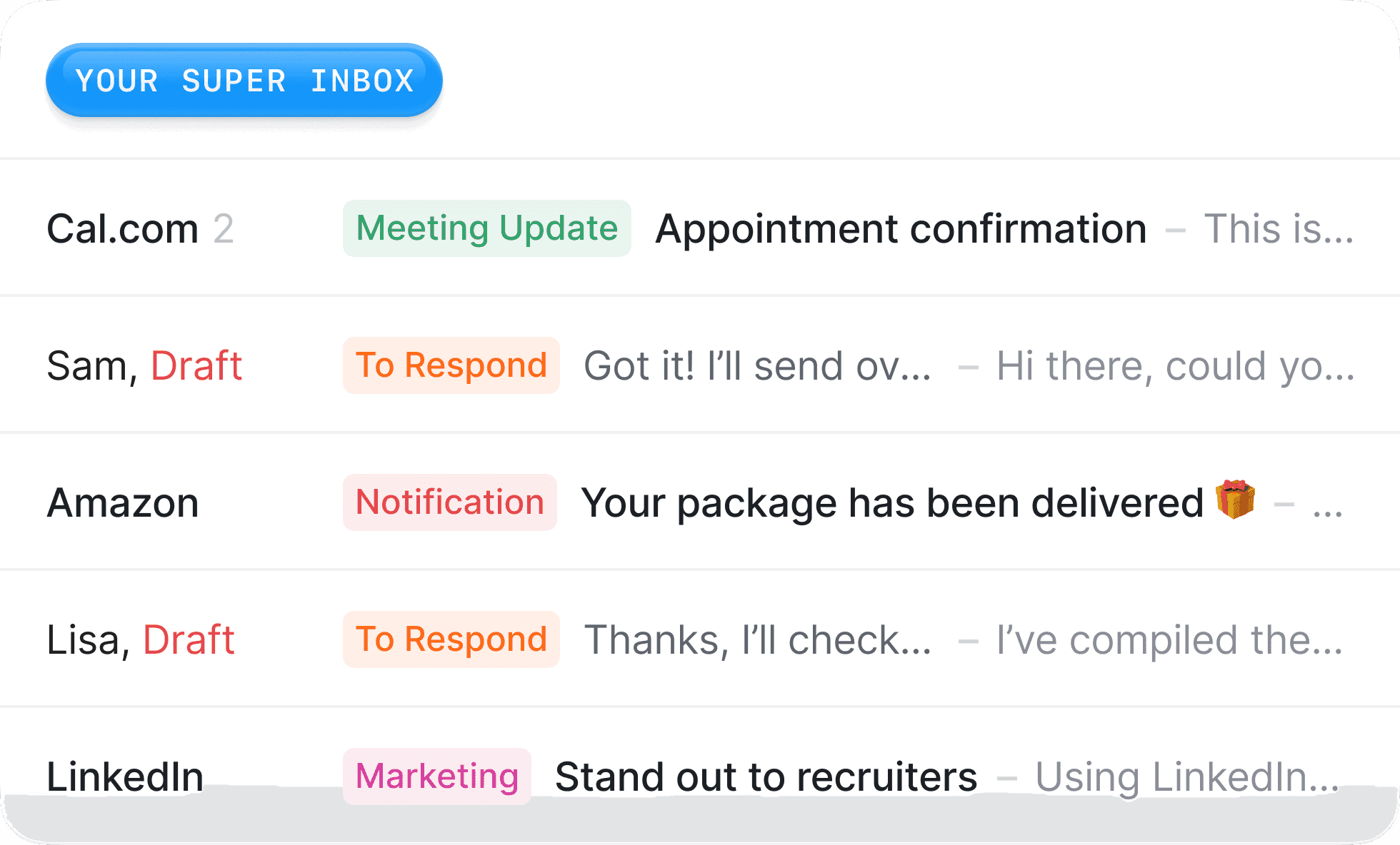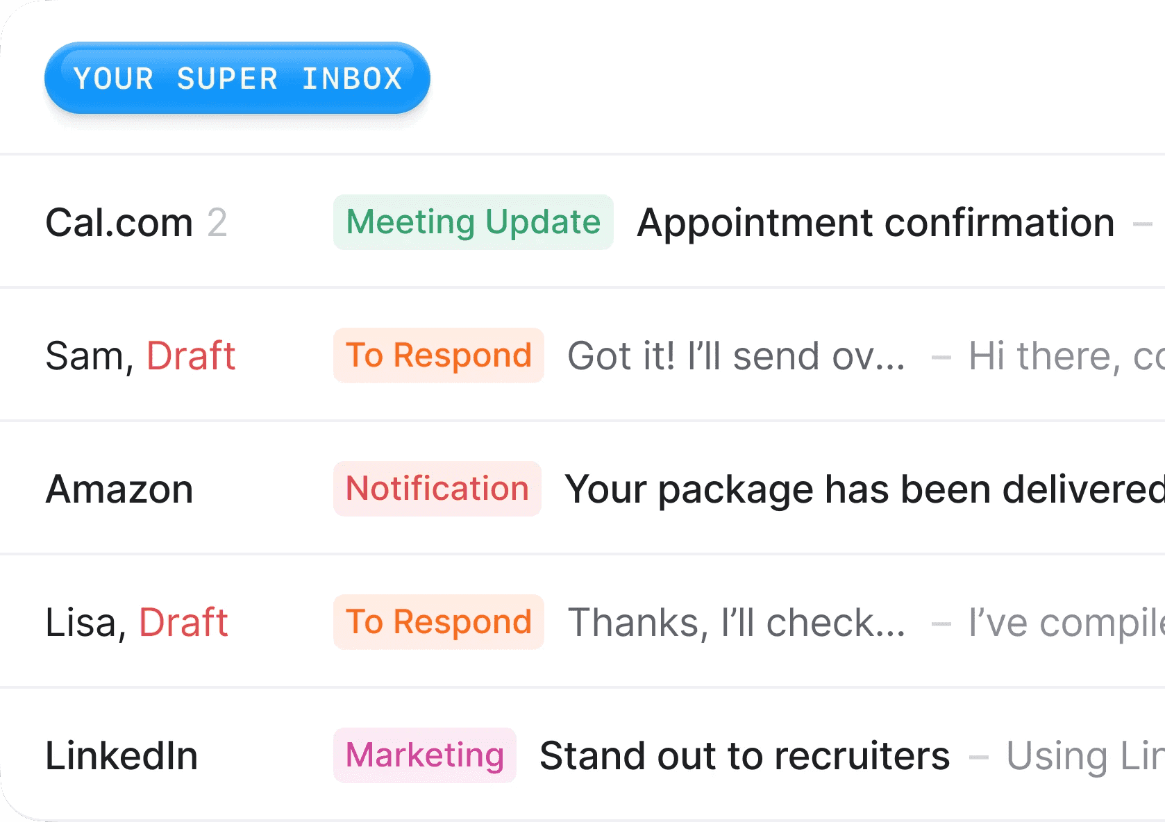 Your Monday with SuperInbox: Open your inbox, see 50 emails with 50 personalized drafts waiting. Each one sounds like you, references the right context, includes your calendar availability. Scan, approve, send. What took 2 hours now takes 20 minutes.